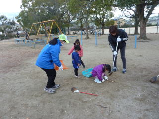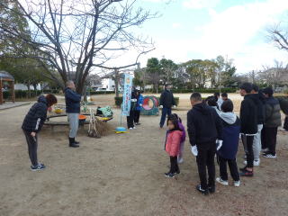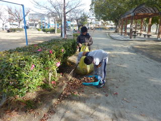 協会職員が参加し、三津大可賀公園を悪戦苦闘しながらも、全員で協力し、清掃活動を