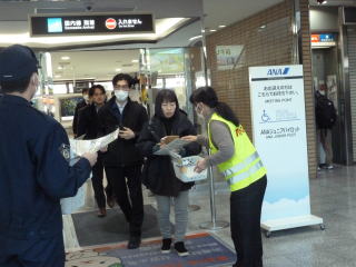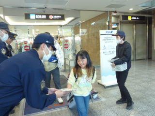 生石支部(5名)、聖カタリナ大学防犯ボランティア、合計17名が松山空港へ到着した人を対象
